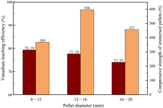 The conditions for pelletizing were 80% iron concentrate with a particle size of −0.074 mm, and the pelletizing time was 20 min. The roasting conditions were MgO/(Ca (OH)2+MgO) mass ratio of 50%, roasting temperature of 1200 °C, roasting time of 2 h, and addition of 1% bentonite. The leaching conditions were sulfuric acid concentration of 3 mol/L, liquid–solid ratio of 4:1, leaching temperature of 80 °C, and leaching time of 75 h. The relationship between pellet diameter, vanadium leaching rate, and compressive strength was studied. The experiments were carried out by heating and stirring pellets of different sizes in three groups in a beaker at a constant temperature according to their specifications. The results in Figure 10 show that the highest vanadium leaching rate of 8–12 mm diameter pellets reached 79.29%, and the highest compressive strength of 12–16 mm diameter pellets was 596 N. When the total mass of pellets was constant, the surface area of small pellets was larger than that of large pellets. This provided smaller pellets with a greater contact area with sulfuric acid, allowing for a more complete and rapid reaction rapid during acid leaching. The interior of the larger pellets was more difficult to oxidize during roasting, which resulted in the incomplete oxidation of some vanadium. This made it more difficult for sulfuric acid to react with the pellets during acid leaching. Therefore, during the pelletizing stage, the optimal pellet diameter range was 12–16 mm.