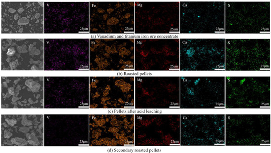 SEM-EDS analysis of the raw ore, roasted pellets, pellets after acid leaching, and secondary roasted pellets was carried out. Figure 12a shows that the distributions of vanadium and iron were highly correlated, indicating that vanadium and iron existed as a compound, while the raw ore contained less magnesium and calcium and was more dispersed. In Figure 12b, the distributions of vanadium and iron were different and overlapped with areas containing calcium and magnesium, indicating that after roasting, vanadium formed magnesium vanadate and calcium vanadate. Figure 12c shows that the pellets after acid leaching contained an uneven distribution of small amounts of vanadium, calcium, and magnesium. The distribution of sulfur overlapped with that of calcium. Figure 12d shows that vanadium was sparsely distributed, indicating that most vanadium entered the acid solution after acid leaching, while the distribution of sulfur was reduced. This indicates that most sulfur was removed after secondary roasting.