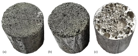 The produced samples of aluminium foams with 3 and 5 wt.% CaCO3 and 0.4 wt.% TiH2 are shown in Figure 2 and their properties are presented in Table 2.