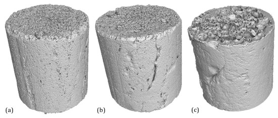 Three-dimensional models of scanned samples foamed with 3 wt.% CaCO3 (a), 5 wt.% CaCO3 (b), and 0.4 wt.% TiH2 (c).
