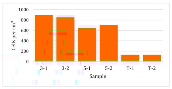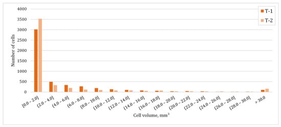 Unlike the previous samples, those that are made with TiH2 as a foaming agent have much larger cells (Table 3). Cell volume distributions for samples T-1 and T-2 are shown in Figure 7. While in the foams with CaCO3 more than 97% of the cells have a volume smaller than 2.00 mm3, in foams T-1 and T-2 this percentage is 61.0% and 72.6%, respectively. In these foams, there are several cells that have a volume larger than 30 mm3, up to approximately 420 mm3.