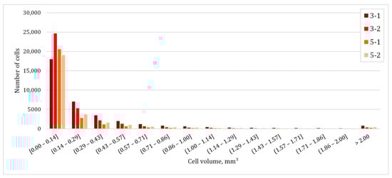 Figure 6 and Figure 7 show the cell volume distributions for samples with 3 wt.% CaCO3, 5 wt.% CaCO3, and 0.4 wt.% TiH2. It is evident that in sample 3-1, approximately 50% of all cells have a volume of up to 0.14 mm3, while in sample 3-2 this percentage is even slightly higher (68.8%). An extremely small number of cells have volumes larger than 2.00 mm3 (2.2% for sample 3-1), and only 0.9% in the sample 3-2. In samples with 5 wt.% CaCO3, the total number of cells is slightly lower (Table 3) but their percentage with a volume of up to 0.14 mm3 is larger; 77.7% for sample 5-1 and 68.9% for 5-2. There are also several cells formed with a volume that exceeds 2.00 mm3; in sample 5-1 this percentage is only 0.9%, and in sample 5-2 it is 1.4%.