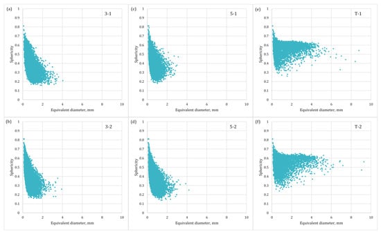 Sphericity versus equivalent diameter for samples 3-1 (a), 3-2 (b), 5-1 (c), 5-2 (d), T-1 (e), T-2 (f).