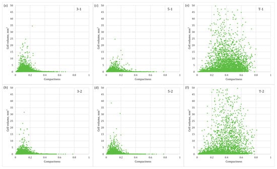 Cell volume versus compactness for samples: 3-1 (a), 3-2 (b), 5-1 (c), 5-2 (d), T-1 (e), T-2 (f).