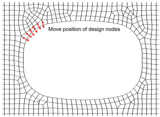 Using the non-parametric shape optimization method, we can consider a hole-type structure as an example. In this approach, the coordinates of finite element nodes on the hole boundary are selected as design variables for optimization. During the optimization process, each node can be individually moved from its adjacent nodes. A schematic representation of coordinate movements for the design variable nodes is shown in Figure 2. Additionally, the nodes near the design variables can be adaptively moved, and to prevent jagged boundaries in the optimized structure, a mesh-smoothing algorithm is employed to ensure mesh quality.