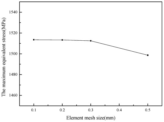 Since the vicinity of a hole was the focus of this study, in the finite element model, the mesh near the hole edge was refined based on a mesh sensitivity analysis, as shown in Figure 6. It was observed that the maximum equivalent stress near the hole edge converged when the mesh size was approximately 0.2 mm. Then, the local mesh size for strength evaluation around the hole edge was determined to be 0.2 mm, while a mesh size of 2 mm was used in the remaining regions to reduce the computational analysis time. The finite element analysis model consisted of a total of 182,490 elements, and 289,011 nodes, as depicted in Figure 7. In Figure 7, the x-axis represents the radial direction, the y-axis represents the circumferential direction, and the z-axis represents the axial direction.