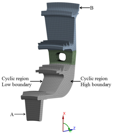 The finite element model was subjected to centrifugal and temperature loads. The centrifugal loads were applied to the model in the form of a rotational speed of 20,868 r/min, while the temperature loads were applied to the nodes, and the temperature distribution was as shown in Figure 8. The axial and circumferential displacements of all the nodes on face A, as well as the axial displacements of all the nodes on face B, were constrained. Additionally, the cyclic symmetry constraint was applied to both the lower and upper boundaries.