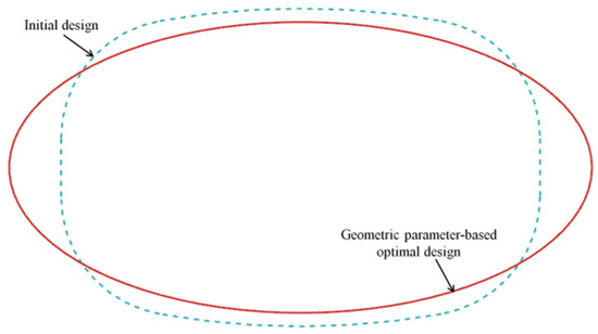 In Equation (1), is the maximum equivalent stress at the hole edge, a is the semi-major axis of the ellipse, and S represents the cross-sectional area of vent hole, which is equal to a specific value, denoted as ‘S0’, according to the requirements of the air system on the vent hole. In this case, S0 was equal to 84.198 mm2. The shape optimization method based on the geometric parameters necessitated adjustments to the relevant geometric model parameters, CAD model re-meshing, and interpolation of the temperature field during each iterative sub-step of the optimization process. Because the cross-sectional area remained basically unchanged, the variations in the vent hole had no significant impacts on the temperature field, and therefore, the temperature load of the finite element model remained unchanged during the optimization iterations. Given that the number of design variables was limited to only one, the NLPQL gradient algorithm [30] was employed in this study to expedite the optimization calculations. Figure 12 illustrates the comparison between the initial design scheme and the optimal design scheme achieved through geometric parameter-based optimization. Furthermore, Figure 13 depicts the distribution of the equivalent stress in the flow guide disk and the vent hole when employing the optimal design scheme based on the geometric parameters.