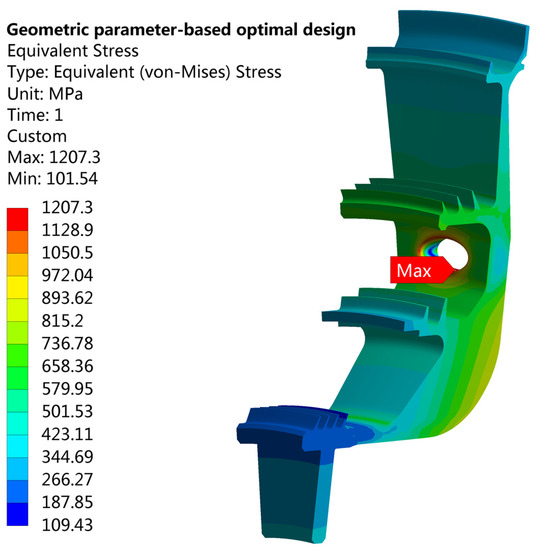 Equivalent stress distribution in the geometric parameter-based optimal design.