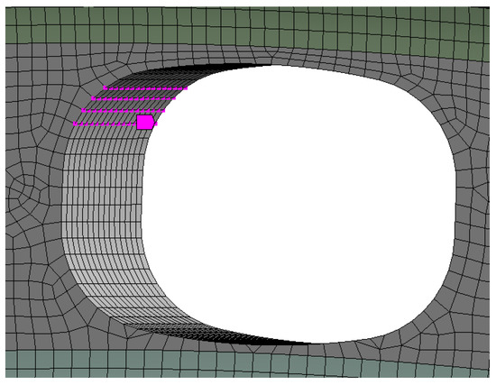 In Equation (2), is the maximum equivalent stress at the hole edge, is the location of node i of the hole edge, and S is the cross-sectional area of the vent hole, which is expected to be kept the same during the optimization iterations. To meet the air system’s restriction requirements for the vent hole’s cross-sectional area, the constraints were transformed to maintain the optimized structure volume equal to the initial design volume. Due to the manufacturability requirements of the vent hole, it needed to be aligned with the basic hole scheme in the axial direction. To meet the engineering manufacturing requirements, constraints were applied to the movement of these design variables. The nodes located at the same angular positions along the hole edges were selected as a group. Figure 14 illustrates the configuration of the four node groups (red nodes) established in this study, totaling 66 groups, ensuring the consistent direction and magnitude of movement for the nodes within the same groups. If this constraint was not imposed, the direction and magnitude of movement for each node within the same group would have been inconsistent, and the hole would not have been smooth along the axil direction. As a result, the optimization outcome could not have been manufactured.