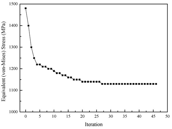 Table 3 provides a comprehensive comparison of the optimization results between the initial design and the optimal design achieved through the non-parametric shape optimization approach. The maximum equivalent stress at the hole edge in the non-parameter-based optimal design was reduced by 24.5%, measuring 1142 MPa compared to the initial design’s stress of 1513 MPa. The non-parametric-based optimal design showcased the successful reduction in stress concentrations, resulting in a more uniform stress distribution throughout the vent hole. These improvements highlighted the effectiveness of the non-parametric approach in achieving stress reductions and enhancing the overall performance of the design. After optimization, the cross-sectional area of the vent hole was approximately 84.304 mm2, which was approximately 0.13% larger than its initial value of 84.198 mm2. This discrepancy was attributed to the error introduced by using spline curves to describe the optimized vent hole mesh boundary. However, this could be accepted by the air system requirements.