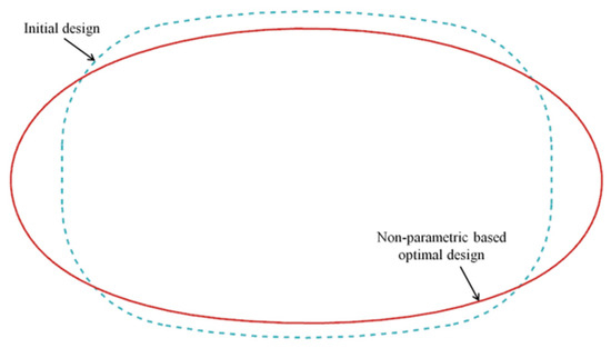 (1) In comparison to the elliptical scheme, the non-parametric-based optimization resulted in a smaller curvature at the location where the maximum equivalent stress occurred. This led to a more uniform stress distribution and a lower maximum equivalent stress value.