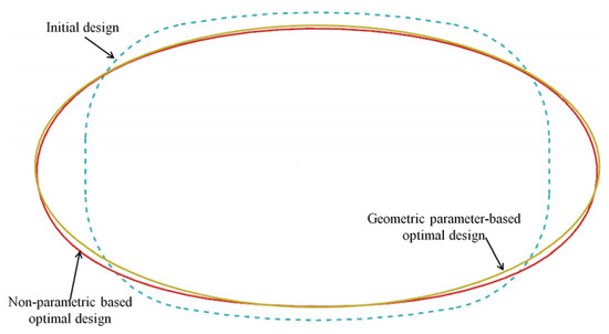 Two optimization methods, namely, geometric parameter-based optimization and non-parametric optimization, were employed to optimize the vent hole in a gas turbine flow guide disk. Figure 18 illustrates the design schemes of the initial design and the optimal designs obtained through the two different optimization methods. The results demonstrated significant changes in the optimal design schemes compared to the initial design. Notably, the optimal designs generated by both methods exhibited similarities, resembling elliptical shapes with slight variations in curvature at certain locations. This indicated that both optimization methods converged towards a similar optimal design solution, emphasizing the effectiveness of both approaches in achieving the desired design modifications.