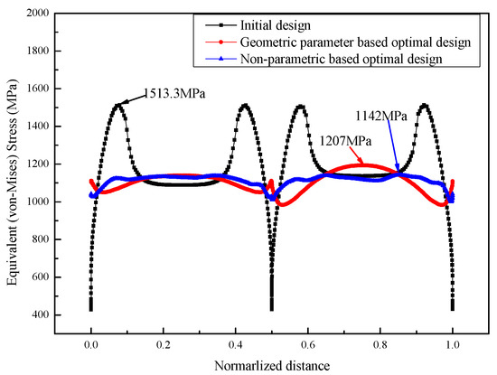 In order to gain a more detailed understanding of the differences between the two optimization methods, Figure 19 provides the equivalent stress distribution along the front edge of the vent hole for the initial design and the two optimal designs, and the following observations can be made: