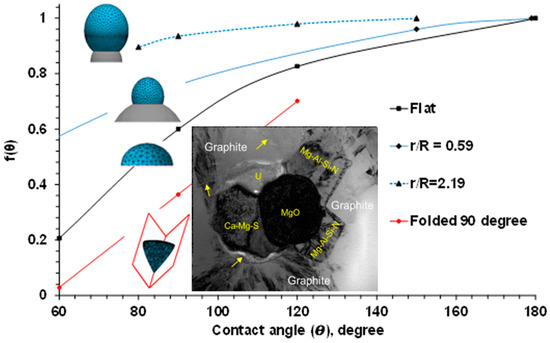 The real solid supports in the melt, which facilitate heterogeneous nucleation, are not infinite and ideally flat. To determine an optimal surface topology of heterogeneous nuclei, SE-FIT software was used in our study [1]. The function f(θ) was simulated for a variety of sizes and shapes of potential heterogeneous nuclei, and the results are plotted in Figure 2. It was found that decreasing the contact angle on an infinitely large, flat substrate reduced f(θ) and the needed undercooling for heterogeneous nucleation (critical undercooling). It should be noted that the effect of the contact angle also depends on the support dimension and geometry. When a nucleus with radius R sits on a small spherical substrate with radius r, decreasing the contact angle does not significantly impact f(θ) or effectively reduce the critical undercooling. It was found that a value higher than the minimal dimensional r/R ratio is needed to effectively facilitate heterogeneous nucleation. The second factor is related to the geometry of the potential nucleation site, which is typically not flat or spherical. For example, formed in the ductile iron melt complex oxide, nitrides and sulfides have irregular shapes comprising convex and concave surfaces or folded internal corners (insertion in Figure 2) [2,3,4,5]. The formation sequence of such complex inclusions during ductile iron melt treatment are described in the next parts of this article. The “folded” inclusions have a significant nucleation advantage relative to a flat support. Complex “folded” precipitates generate additional sites for continuous nucleation. The different process routes to develop such complex heterogeneous nuclei in liquid alloys by in situ chemical reactions are discussed in the later sections.