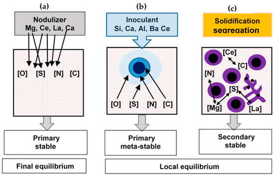 Methods used to simulate reactions during SGI processing: final equilibrium between elements dissolved in melt and active additions in the nodulizer (a), simulation of meta-stable precipitates in inoculant dissolution zones (b) and coupled simulation of solidification segregation and chemical reactions in the mushy zone (c) [3].
