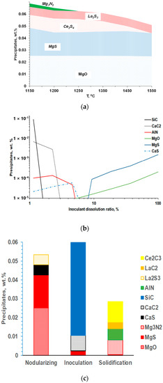 Thermodynamic prediction of inclusion family developed during melt nodularization with Mg-Ce-La addition (a), simulated meta-stable precipitates formed during Fe-Si base inoculant dissolution (b), and families of inclusions formed during entire SGI process (c) [3].