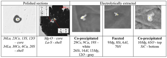 The thermodynamic simulations predict a variety of precipitates formed during SGI processing, mold filling, and casting solidification. To verify these predictions, the automated SEM/EDX analysis of inclusion family was performed [3,6]. A procedure for separately searching for nuclei in the center of graphite nodules and located in the metal matrix was developed. To achieve reasonable statistical results, up to 10,000 nodules were searched, which gave information about several hundreds of nuclei. Examples of individual non-metallic inclusions detected inside graphite nodules on the polished cross section and electrolytically extracted from the matrix are provided in Figure 5.