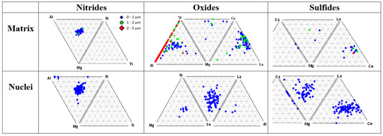 Ternary plots of classified oxides, sulfides and nitrides located in the matrix and at the center of graphite nodules are presented in Figure 6. Three classes of precipitates were detected in the metal matrix and inside the graphite nodules: complex Mg-Al-Si nitrides, complex Al-Si-Mg and Mg-Ce-La oxides, and Mg-Ca and La-Ce sulfides. These types of reaction products in the melt were predicted by the thermodynamic simulations (Figure 4). The studied ductile iron contained a limited amount of other nitride-forming elements (Ti and Zr); therefore, only the complex Mg-Al-Si nitrides were detected in this case.