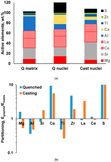 Average composition of active elements (note that S is plotted above 100%) (a) and partitioning coefficients of active elements between nuclei and matrix in quenched and cast SGI (b) [3].