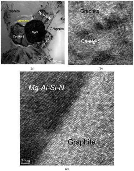 The authors [7] conducted detailed atomic-resolution TEM (transmission electron microscopy) analysis of the interface between the complex heterogeneous nuclei and the graphite nodule and discovered evidence of meta-stable reaction products, which could have formed during the inoculation process (Figure 8).