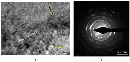 Nanocrystal band on graphite/nuclei interface: (a) high-resolution TEM image and (b) selected area diffraction pattern [7].
