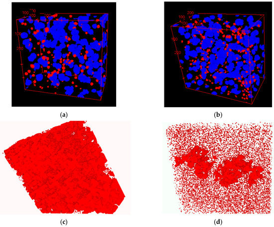3D distribution of large (blue) and small (red) graphite nodules (a,b) and rendered microporosity (c,d) in SGI#1 (a) and SGI#2 [10].