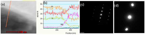 TEM STEM bright-field image of boundary between Ti-based (dark) and Nb-based (bright) phases with the scanning line (a), EDX line scan result (b), and electron diffraction pattern from overlapped boundary between two phases (c,d).