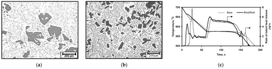 Microstructures of aluminum alloys with 18% Si: (a) base case and (b) modified by 0.05% P, and (c) thermal analysis of both alloys.