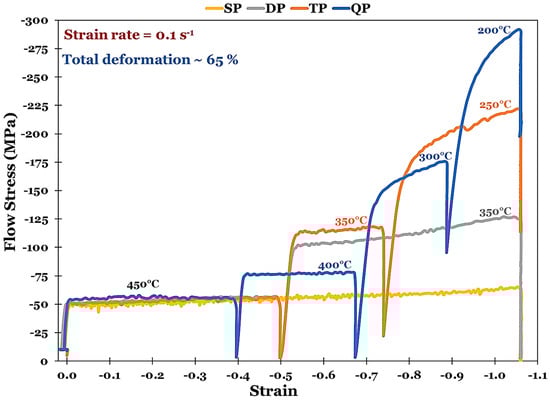 Hot compression tests utilizing a Gleeble simulator are employed to identify the material’s flow behavior during thermomechanical processing. This tool is reliable and capable of simulating actual industrial operations. Accurate flow behavior characterization during thermomechanical processing can help material designers select the processing parameters. Figure 2 presents the flow curves during the different designed TMPS. At the processing conditions of the SP (Figure 1a), i.e., approximately 65% deformation at 450 °C, dynamic recrystallization is likely to occur. However, the flow curve of SP shows no flow softening. This observation is in agreement with the results of Guo-Zheng et al. [], who examined the influence of deformation temperature in the range of 250–450 °C on the flow behavior at approximately 80% deformation and a strain rate of 0.1 s−1. They found that no dynamic softening occurs at 450 °C and this is consistent with the current findings of SP. On SP, the flow stress is slightly increased during deformation due to the flow hardening as a result of precipitation and dislocations multiplying, interacting, and piling up [,]. This can be interpreted as the influence of flow hardening due to precipitation is dominant and stronger than the influence of dynamic recrystallization on the flow stress. Moreover, dynamic recrystallization does not always reduce the flow stress as it adversely affects the strength, as reported by Jiang et al. []. Dynamic recrystallization reduces the density of dislocations, resulting in a reduction in strength. Simultaneously, it leads to the formation of finely equiaxed grains, hence enhancing the strength due to the grain refinement strengthening mechanism.