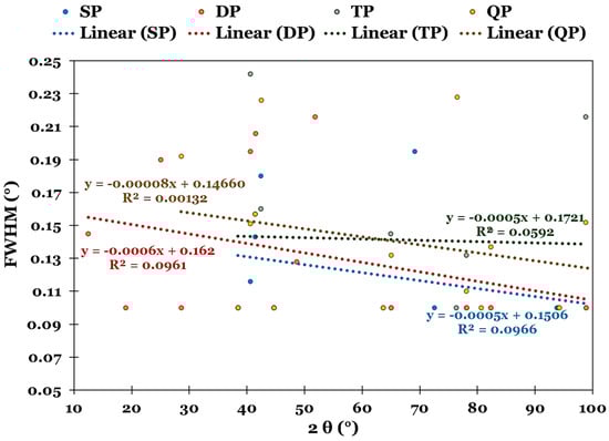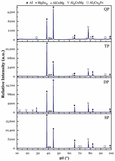 Another possible explanation for inclined grains is the presence of a non-uniform texture in the material. Even in a perfectly symmetrical rolling process, the texture can be non-uniform due to various factors, such as variations in the crystallographic orientation of the grains or variations in the deformation path. This non-uniform texture can cause certain grains to become inclined or tilted relative to the rolling direction. It is also possible that the inclination of grains in the material is not solely a result of the rolling process but is due to prior processing steps, such as casting or forging. These prior processing steps can introduce non-uniformities in the microstructure, affecting grain orientation and inclination during rolling. In summary, while there is no physical reason for grains to become inclined in a perfectly symmetrical rolling process, real-world factors such as non-uniform deformation, non-uniform texture, and prior processing steps can all contribute to the inclination of grains in the material. Measuring the grain size from the hot-rolled microstructure is often inaccurate as the deformation marks in the rolling directions and the boundaries of the elongated grains are difficult to distinguish using the optical microscope. For this reason, the FWHM data are used to indicate crystal size, while the peak intensity indicates the fraction of the different precipitates. The changes in the FWHM value are caused by lattice strain during deformation and grain size changes along the rolling direction []. XRD profiles of specimens after TMPS confirm the presence of the same phases with different percentages and sizes, as indicated by the difference in intensity and FWHM in the different XRD profiles, respectively. All the thermomechanically processed alloys are composed of MgZn2, AlCuMg, Al2CuMg, and Al7Cu2Fe in an Al base. Table 3 presents the position, intensities, and full width at half maximum for the different detected phases. It can be observed that QP has the highest fraction of fine precipitates as the FWHM is inversely proportional to the grain size []. Figure 7 shows a relationship between the FWHM and peak position (2 θ). It can be concluded that SP exhibits the coarsest grain size, while TP and QP have comparable fine grain sizes. However, DP has an intermediate one. These results confirm the grain size that was manually estimated, as mentioned above.
