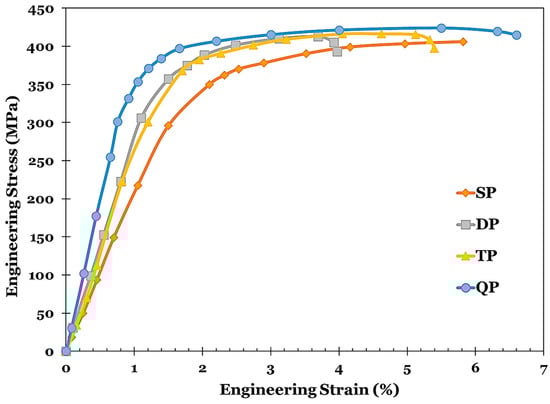 Figure 8 depicts the engineering stress-engineering strain curves for the practically thermomechanically processed sheets. The tensile characteristics in the rolling direction are summarized in Table 4. All the TMPS promote the ultimate and yield strength compared with the as-received material. This is attributed to the combined effects of stretching the grains along the rolling direction (Figure 5), as the texture orientation influences the mechanical properties of hot-rolled Al 7075, as reported by Jiang et al. []; moreover, the dominant deformation mechanisms of work hardening mechanism as revealed from the flow behavior (Figure 2), and grain refinement strengthening mechanism as revealed from FWHM versus position chart after applying the designed TMPS (Figure 7). QP shows the highest strength and ductility compared to the other TMPS, followed by TP and DP. The SP results in the lowest yield and ultimate strengths compared with the other TMPS. This may be due to the grain refinement mechanism that is more pronounced in QP and TP, enhances the mechanical properties.