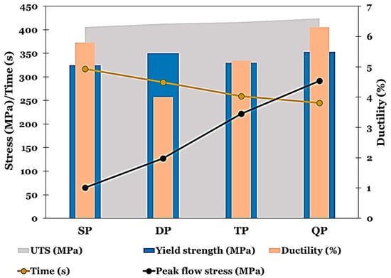 Studying Al-alloys’ response at high temperatures is essential for estimating the magnitude of load required for any application-included loading condition and for high-temperature forming of the alloy. Many engineering applications ask for parts that can function at high temperatures; as a result, the high-temperature behavior of the thermomechanically processed AA7075 alloy needs to be thoroughly studied []. For designing a cost-effective processing strategy to produce 7075 Al sheets, the manufacturing line’s implementation time must be considered. Shortening the processing time is desirable [,]. The overall TMPS time is estimated in the current work. The schedule for the designed TMPS is summarized in Table 2. In general, from a cost-saving perspective, the QP strategy is most successful one to produce 7075 Al sheets as it meets the time-saving demand of 244.71 s and satisfy the criteria of light deformation per pass; therefore, enhancing the industrial feasibility and productivity. TP and DP require 259.31 and 288.72 s to be implemented on the production line, respectively. SP needs the longest production time of 317.2 s.