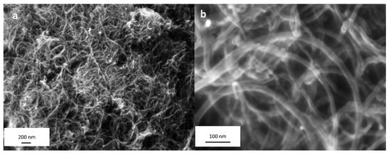 (a) SEM image showing the morphology of the CNTs used in the current study. (b) Further magnification of the CNT sample shows CNTs with diameters ranging between 8 and 23 nm.
