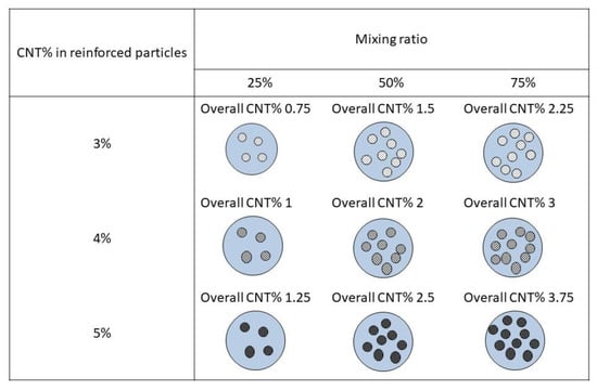 A Retsch® high energy planetary ball mill (PM400 MA-type) was used to produce 3, 4, and 5 wt.% Al–CNT composite powders. Gas-atomized ALPOCO© Al powder (purity > 99.7% and average particle size 75 µm) and Elicarb© MWCNTs (purity 70–90%, average diameter 10–12 nm, length tens of µm and density range 1.7–1.9 g/cm3, shown in Figure 1) were added in stainless steel milling jars of 250 mL volume, with 42 stainless steel milling balls of 10 mm diameter, and milled under Argon. Ball to powder ratio (BPR) of 5:1 and a milling speed of 400 rpm was used. The mixtures were milled for 1 h but interrupted every 10 min by a 20 min pause for cooling. High-purity ethyl alcohol supplied by SIGMA–ALDRICH® was used as a process control agent (PCA) with varying volumetric amounts relative to the CNT concentrations. For 3, 4, and 5 wt.% CNTs, the amount of ethyl alcohol used was 110, 70, and 50 µL, respectively. The milled Al–CNT powders were mixed with powders of unmilled pure Al using mechanical mixing in a Retsch® turbula mixer at a speed of 96 rpm for 30 min. Powders were prepared with mixing ratios of 25, 50, and 75% of reinforced particles to soft unreinforced Al. Figure 2 presents an illustration of the various dual-matrix microstructures prepared in the current study. The darker reinforced particles have higher CNT contents, and the larger number of particles in the microstructure represents higher mixing ratios. The mixed DM powders were subsequently compacted into 20 mm diameter compacts under a pressure of 350 MPa at room temperature for 1 h using a single-acting FOSTER® hydraulic press. The compacts were then sintered at a temperature of 500 °C for 1 h and extruded into 10 mm diameter rods. Finally, the die and the extrudate were covered by thermal insulation and left to cool slowly to room temperature.