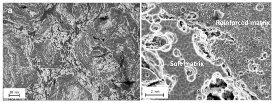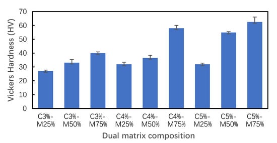 Dual-phase materials consisting of a soft and a hard phase have been used for years in wear applications due to their outstanding combination of desirable properties. One common example is the tungsten carbide–cobalt (WC–Co) composite. The hard WC phase provides excellent wear resistance, while the soft Co matrix provides toughness and reduced friction, making the composite ideal for use in wear applications such as cutting tools, milling inserts, and wear-resistant coatings. Dual-matrix composites are similar to dual-phase materials. Typically, the reinforcement phase is distributed throughout one matrix, then embedded in the other matrix. Such microstructural design has the advantage of combining enhanced strength, hardness, wear resistance, toughness, and ductility. Accordingly, dual-matrix composites have been increasingly investigated as potential materials for wear applications. Various reinforcements and volume fractions have been investigated. A major advantage is the ability to tailor the characteristics of both the matrix and the reinforced composites to achieve the desired performance [23,24,25,26,27]. A dual composite of WC–Co was developed by Fang et al. [28] by embedding fully dense, large WC–Co particles in a cobalt matrix. The new material was found to have higher fracture toughness at the same wear resistance compared to conventional WC–Co.