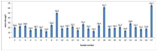 Wear investigation was conducted for five control parameters, with each having three level values (Table 1) according to Taguchi L27 orthogonal array (313) (Table 2) [40]. The wear rate was recorded for three replicates at each sample condition. To study the effect of the control parameters in maximizing or minimizing the response, the signal-to-noise ratio (S/N) was calculated. ANOVA analysis was used to determine the significance of each control parameter [42,43,44,45]. A mathematical regression model was built to capture the effects of the control parameters on the response [34]. The model was used to plot response surfaces that represent the combined effects of the control parameters on the wear rate [42,46,47].