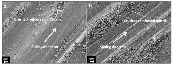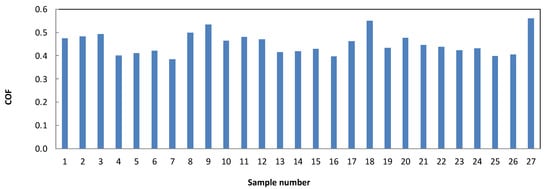 On the other hand, the highest wear rate (WR = 65.7 µg/s) and COF (0.561) occurred for sample no.27 (C = 5%, M = 25%, S = 1.5 m/s, L = 20 N, and D = 1 Km). The worn surface of the sample presented in Figure 7c shows deep grooves, and the dominant wear mechanism appears to be abrasive with the presence of delamination and cracks on the surface. Further magnification in Figure 7d shows that fragmentation occurred in the reinforced matrix, with the resulting hard debris causing abrasive wear. The COF time plot of sample no.27 presented in Figure 8 shows intensive fluctuation reflecting the severe fragmentation of the reinforced particles. It is worth noting that samples no.9 and 18 also demonstrate higher wear rates than all other tested samples, as can be clearly noticed from Figure 5. Both samples have 25% mixing ratio which is similar to sample no.27 and were tested under similar conditions to sample no.27 (S = 1.5 m/s, L = 20 N, and D = 1 Km). The only difference is the lower composition of the CNT in the reinforced particles, which is 3% and 4% in samples no.9 and 18, respectively, compared to 5% in sample no.27.