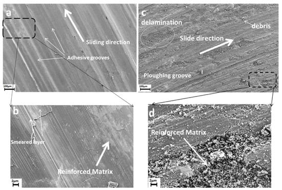 SEM worn surfaces for samples with (a) the lowest wear rate (sample 7: C3%, M50%, D1.4 Km, L8 N, S1.5 m/s), (c) the highest wear rate (sample 27: C5%, M25%, D1 Km, L20 N, S1.5 m/s), (b,d) are magnified images of (a,c).