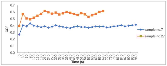 COF time plot of sample no.7 (lowest wear rate sample: C3%, M50%, D1.4 Km, L8 N, S1.5 m/s) and COF time plot of sample no.27 (highest wear rate sample: C5%, M25%, D1 Km, L20 N, S1.5 m/s).