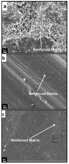 ANOVA analysis revealed that the applied load (L) is the most effective parameter in increasing the wear rate. Figure 9 presents further analysis of the effect of load on the interface between the Al–CNT reinforced matrix and the Al matrix. At the highest load of 20 N in Figure 9a, the reinforced matrix is exposed to high fragmentation that appears to reduce its lubricating effect. In addition, the wear mechanism turns abrasive. At the applied load of 14 N in Figure 9b, the reinforced matrix has surface cracks. On the other hand, at an applied load of 8 N in Figure 9c, the reinforced matrix is completely flat, and the CNT works as a lubricant. The mixing ratio (M) is found to be the next effective parameter. It was found that the wear rate decreases at (M) from 25% to 50%, but then it increases at (M) from 50% to 75%. Local plowing resulting in pulled-out areas on the surface at a 75% mixing ratio was observed. Typically worn surfaces showing pulled areas are presented in Figure 10a,b for sample no.4 and sample no.17, respectively. It is believed that the high difference in hardness between the reinforced matrix and the Al matrix caused the interface between them to be weak, that in turn facilitated the pull-out of the reinforced matrix even at low loads. Tensile strength investigations of dual-matrix Al–(Al–CNT) composites were conducted in another study by our research group and showed that composites with a mixing ratio of 75% have lower strength than dual-matrix composites with a 50% mixing ratio. This was attributed to the weaker interface associated with the larger overall interfacial area as the number of reinforced particles in the matrix increases [32].