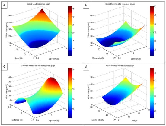 (a–d) Response surface graphs of the combined effects of the control parameters on the wear rate.