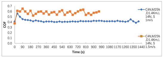 Effect of speed on COF time plot of sample (C4%, M25%, D1.4 Km, L14 N).