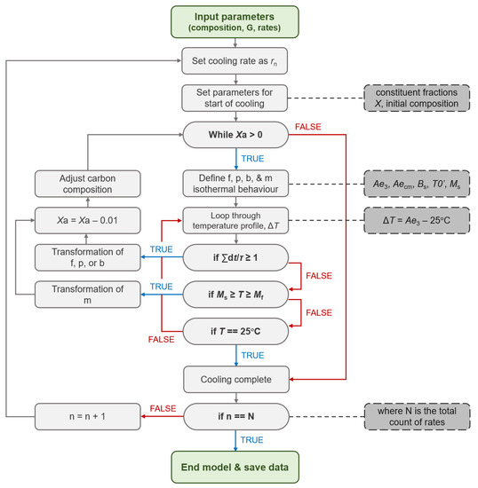 The basis of the model works by looping through austenite fractions, , and determining what each fraction of austenite will transform into, whether that be ferrite—f, pearlite—p, bainite—b, or martensite—m. For each fraction of austenite, a temperature profile is looped through. At each temperature, isothermal incubation times are calculated (, , ) and the additivity rule is tested. Once the additivity rule reaches unity for a specific constituent, a percentage of that constituent is deemed to be formed, and the temperature loop restarts with updated parameters. The carbon content in the untransformed austenite is adjusted as per the carbon partitioning model and the kinetic driving forces of the system are redefined. If the additivity rule is never satisfied, and the temperature reaches the martensite regime, the model deems there to be a martensitic transformation with any subsequent martensitic transformations occurring as per the Koistinen–Marburger relation. This continues until either all available austenite has been used up (i.e., = 0) or the temperature reaches 25 °C (i.e., ambient room temperature). The model repeats for each cooling rate until all rates have been tested. The raw data that are outputted exist in the form of transformation temperatures () for each percentage of constituent (X%) formed, over each cooling rate tested. From this, CCT data can be plotted and the final constituent fractions gathered. A flowchart depicting the layout of the model is presented in Figure 2.