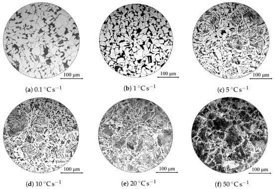 A BH2 series Olympus optical microscope (Evident Corporation, Tokyo, Japan) was used to examine the post-treated microstructure of dilatometry samples and support dilatometry conclusions. Sample cross sections were polished to a 0.25 m finish and etched using 2% Nital etchant. Microhardness analysis was conducted on post-treated dilatometry samples. A Matsuzawa MMT-X7A microhardness indenter (Matsuzawa Co., Ltd., Akita, Japan) was used to collect a total of 16 hardness measurements per specimen using a 1 kg force, over a dwell of 10 s. Hardness readings were measured across the cross-sectional surface of the cylindrical dilatometry specimens. Care was taken to ensure measurements were taken at least 500 m apart to minimise any potential effects of deformation on subsequent readings.