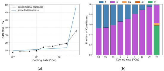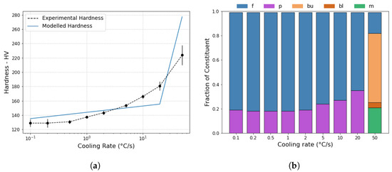 (a) A plot showing the EN3B experimental hardness with cooling rate and modelled hardness predicted by the results of the proposed model. (b) The final constituent fractions for EN3B predicted by the proposed model at each cooling rate. Constituent nomenclature includes: f—ferrite, p—pearlite, bu—upper bainite, bl—lower bainite, and m—martensite.
