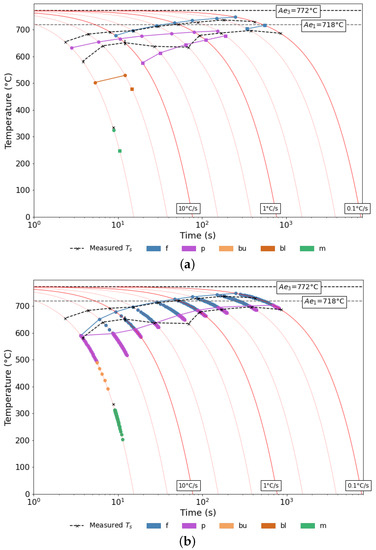 There has been a significant amount of research dedicated to the prediction of steel transformation behaviour, primarily for isothermal transformations, as many of the classical first-theory principles are based around such conditions. Some attention, however, has been given to non-isothermal predictions, especially through the incorporation of Scheil’s additivity rule, which converts TTT to CCT behaviour [4]. Most of this attention has been focused on modelling two important features: start and finish transformation times (/), and final product fractions (X). There are three types of modelling approach that can be distinguished: empirical regression modelling, semi-empirical physical modelling, and fundamental thermodynamic modelling. The latter focuses on fundamental thermodynamic theory, usually requiring complex modelling and large processing power [5,6]. In contrast, simplified empirical models have been successful in predicting steel CCT behaviour quickly and accurately [7,8]. These models, though favourable, are limited to their regression data ranges and, if extrapolated outside of them, can become unreliable. More recently, the use of machining learning and deep learning artificial neural networks (ANNs) have improved the accuracy of empirical CCT predictions and expanded the predictive capabilities of CCT models by allowing larger composition ranges to be considered within one model [9,10,11,12]. Nevertheless, machining learning regression models are still limited to the size of their data ranges, as well as the accuracy and extensiveness of the datasets used. Many models are thereby restricted to the prediction of constituent and , as this is all that is generally provided in most CCT datasets. Empirical models therefore do not consider the intricacies of steel behaviour, such as nucleation and growth, and are thereby limited to trend-based predictions. Semi-empirical models combine the usability of empirical models, with the extrapolation potential of fundamental thermodynamic modelling [13,14]. Because of this, semi-empirical models are quick and easy to use but, by considering thermodynamic and kinetic behaviours, are more versatile than simple empirical assessments.