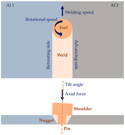 Among these technologies, friction stir welding is a sustainable and green solution in terms of energy consumption and environmental impact [15,16,17,18,19]. Moreover, it is characterized by a limited set of process parameters: tool rotational speed, welding speed, axial force, and tool tilt angle, which are the main parameters that are involved in production of high-strength joints [20,21] (see Figure 1).