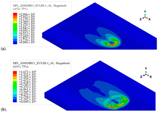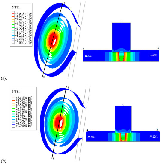 - Plasticized zone size around the tool: it affects the intensity of plastic deformation and through this influences material mixing [31,73]. Moreover, a higher rotational speed can lead to a larger plasticized zone, which can result in a better bond between the two workpieces [121,122,123].
