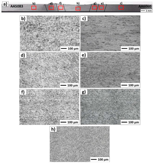 Macrostructure of the weld produced with a tool rotational speed of 1200 rpm (a) and microstructures of base metals AA5083 (b), AA6060 (c), HAZ on AA5083 side (d), HAZ on AA6060 side (e), TMAZ on AA5083 side (f), TMAZ on AA6060 side (g) and the weld nugget (h) [131].
